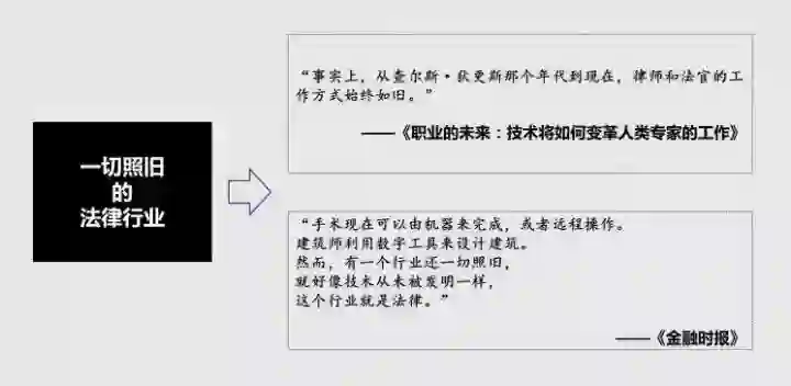 《职业的未来》一书的作者萨斯金写道,事实上,从查尔斯·狄更斯那个年代到现在,律师和法官的工作方式始终如旧。《金融时报》此前也发文称,对于法律行业而言,技术好像从未被发明一样。而其他很多行业都被互联网技术改造了,电商系统和无人零售重塑了零售业,机器人诊疗和手术已经在深度介入医疗行业,股票市场80%的交易是由算法控制的,生产制造过程由自动化、智能化的系统控制,等等。为什么法律行业会落在后面呢,有其自身原因,但更多值得我们深思。