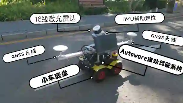 如下图,无人小车搭载了16线激光扫描仪,以及GNSS定位天线和IMU,小车内置电脑中搭载了Autoware自动驾驶系统,以及小车的控制底盘。