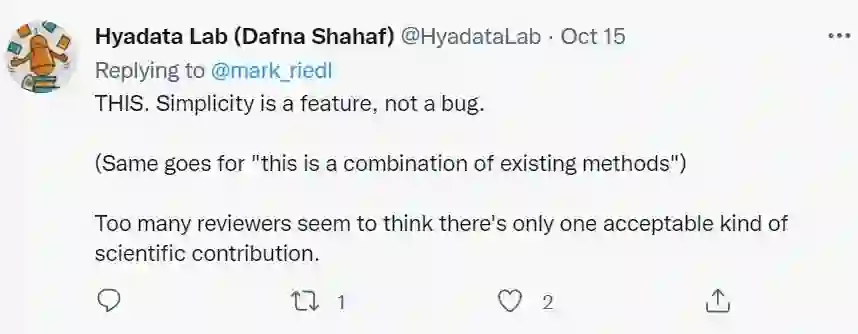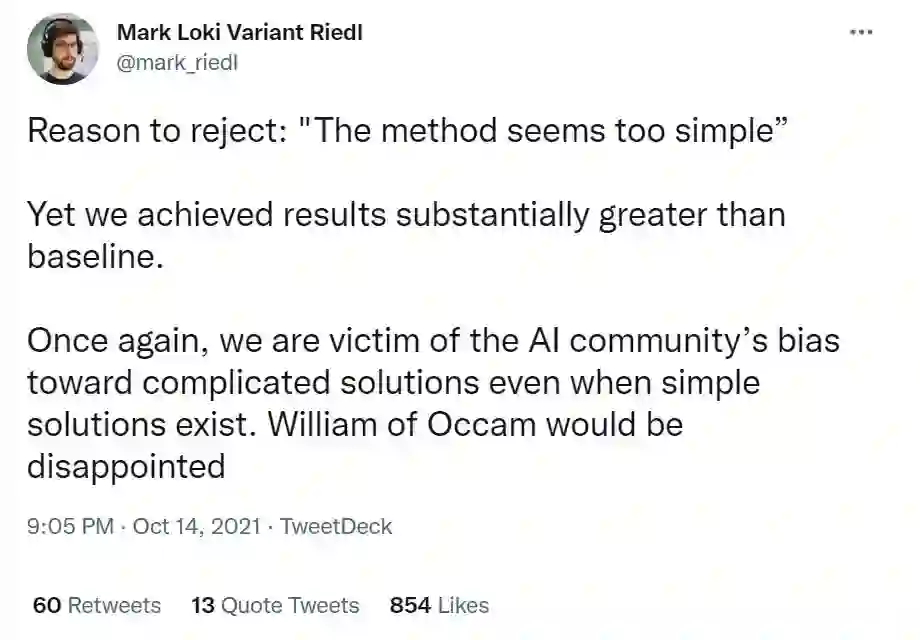 如果你看到自己实验行之有效的论文被退稿,而收到的退稿理由仅仅是“方法太简单”,你会怎么想? 这两天在推特上,佐治亚理工的 Riedl 教授吐槽了自己收到的 AAAI phase 1 退稿理由居然是因为“这方法似乎太简单”,引起了广泛的讨论。 >>加入极市CV技术交流群,走在计算机视觉的最前沿