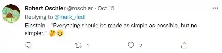 在推文中, Riedl 教授使用了奥卡姆剃刀原理为自己辩护,即“因为‘如无必要,勿增实体’,那么如果我的解决方法简单有效,为什么还要求我使用一个复杂模型呢?”。然而,奥卡姆剃刀原理作为一个经验性的法则,它并不是“保真”的。换言之,奥卡姆剃刀原理它并不一定在所有情况下都正确。事实上,我们会发现用于论证这个法则的常常是一些安排妥当的例子,譬如在管理学的课堂上经常讲述这样一个故事: