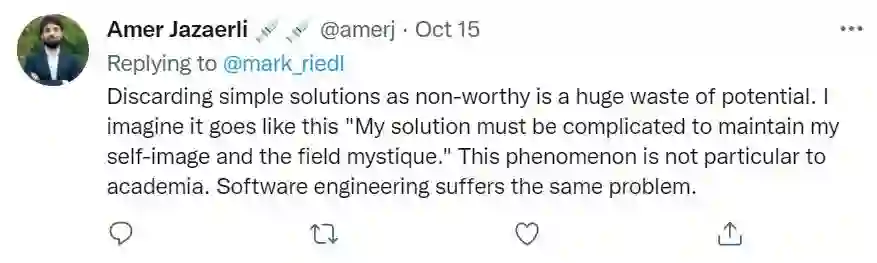 事实上对“一篇论文是否应该由于方法简单而被拒稿”这一问题做出价值判断是相当容易的。更加有趣的是 Riedl 教授的两点引申:一点是他提到的“如无必要,勿增实体”奥卡姆剃刀原理,另一点则是他指出的学术界对“简单方法”的偏见。
