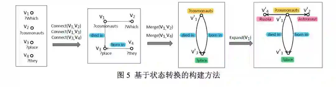 3) 基于状态转换的构建方法 (EMNLP2018[3]) 使用序列标注模型识别句中节点后,在训练好的子图打分模型的监督下通过预定义的四种状态转换操作逐步生成语义查询图,最后使用多通道卷积神经网络 (MCCNN) 识别相应关系。该方法可以生成更复杂的查询图结构(例如带环的查询),在 QALD-6、WebQuestions 和 ComplexQuestions 测试集上 F1 得分分别为 0.80, 0.536 和 0.543。