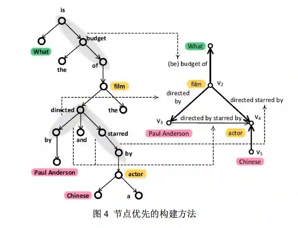 1) 关系优先的构建方法 (SIGMOD2014[1]) 先通过谓词复述词典识别问题中的关系(谓词),再通过启发式规则确定关系两边的节点(实体/疑问词)。一些相关工作中使用神经网络来进行关系抽取的方法往往将问题整体作为输入,只能输出一个识别出的关系从而不能回答多跳问题。而该方法通过句法依存树进行模板匹配能识别出多条关系从而可以回答多跳问题。其在 QALD-6 和 WebQuestions 测试集上 F1 得分分别为 0.55 和 0.312。