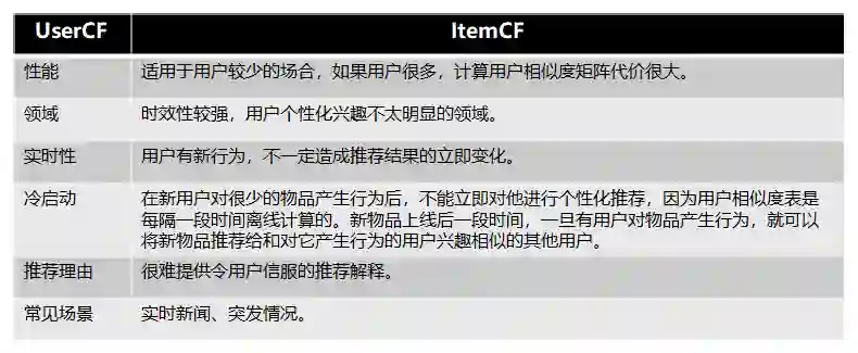 UserCF 给用户推荐那些和他有共同兴趣爱好的用户喜欢的物品,而 ItemCF 给用户推荐那些和他之前喜欢的物品类似的物品。