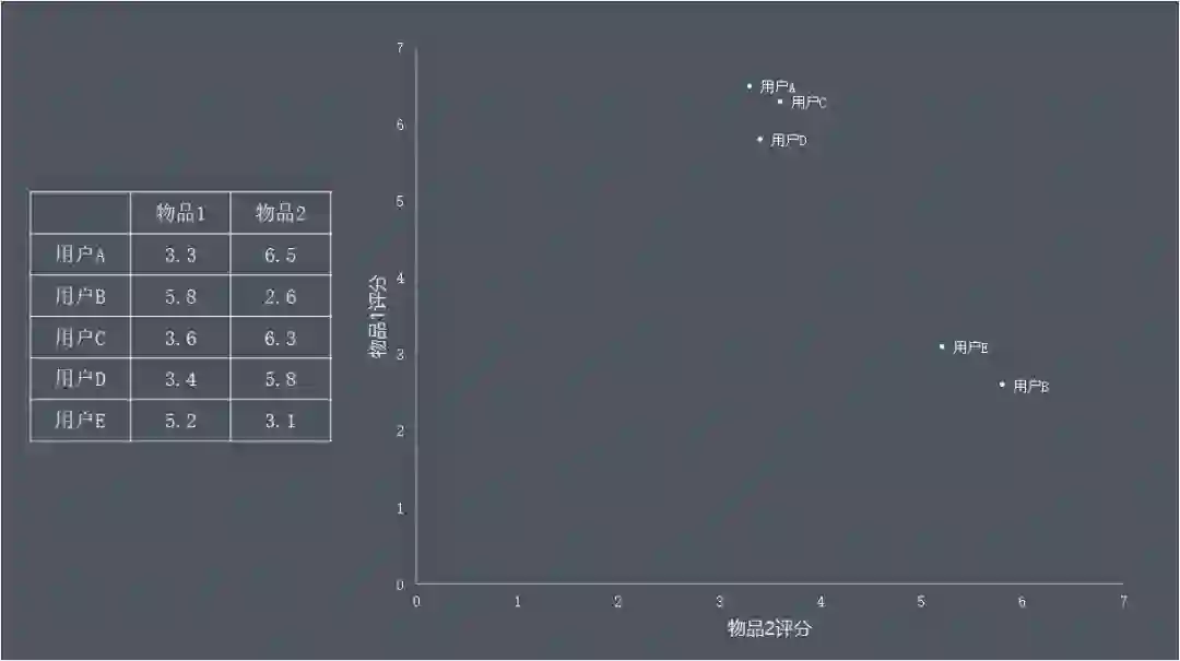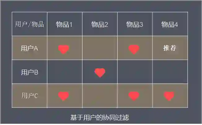用户 A 与用户 C 的兴趣比较相似,用户 C 喜欢了物品 4,所以给用户 A 推荐物品 4。