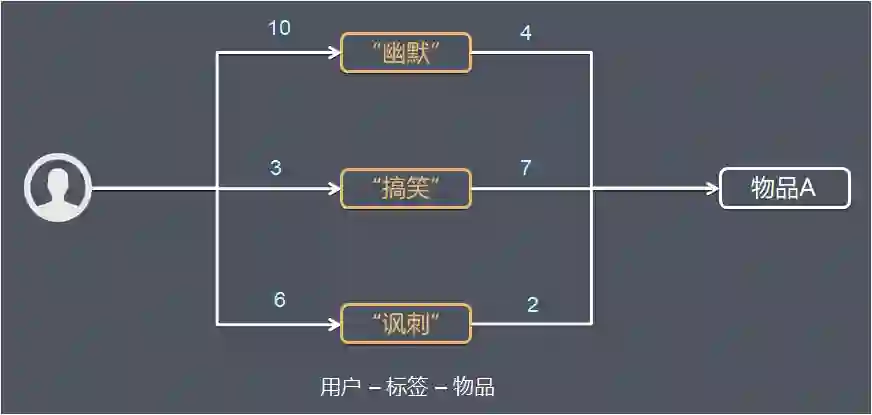 某用户使用过“幽默”标签 10 次,“搞笑”标签 3 次,“讽刺”标签 6 次。这 3 个标签被物品 A 使用的次数分别的 4、7、2。
