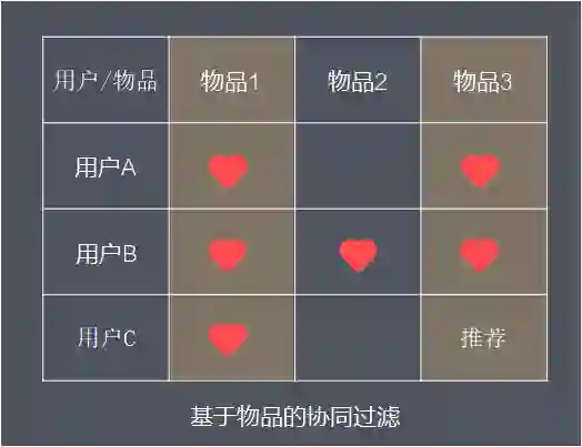 物品 1 和物品 3 都被用户 A 和用户 B 喜欢,所以认为是相似物品,所以当用户 C 喜欢物品 1,就给用户 C 推荐物品 3。