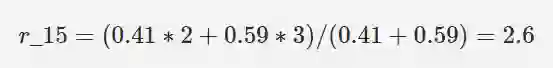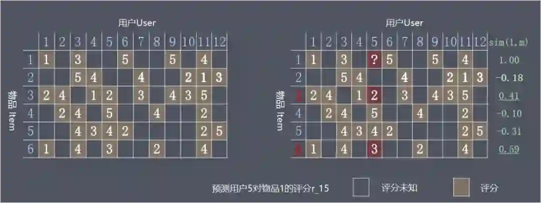 需要用户 5 对物品 1 的评分 r_15,由于物品 3、物品 6 是与物品 1 最为相似的 2 个物品,取相似度作为权重,所以 r_15 可以预测如下: