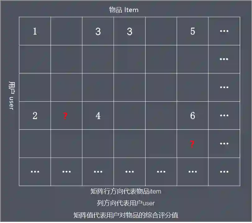 已知用户评分矩阵 Matrix R(一般都是非常稀疏的),推断矩阵中问号处的评分值。