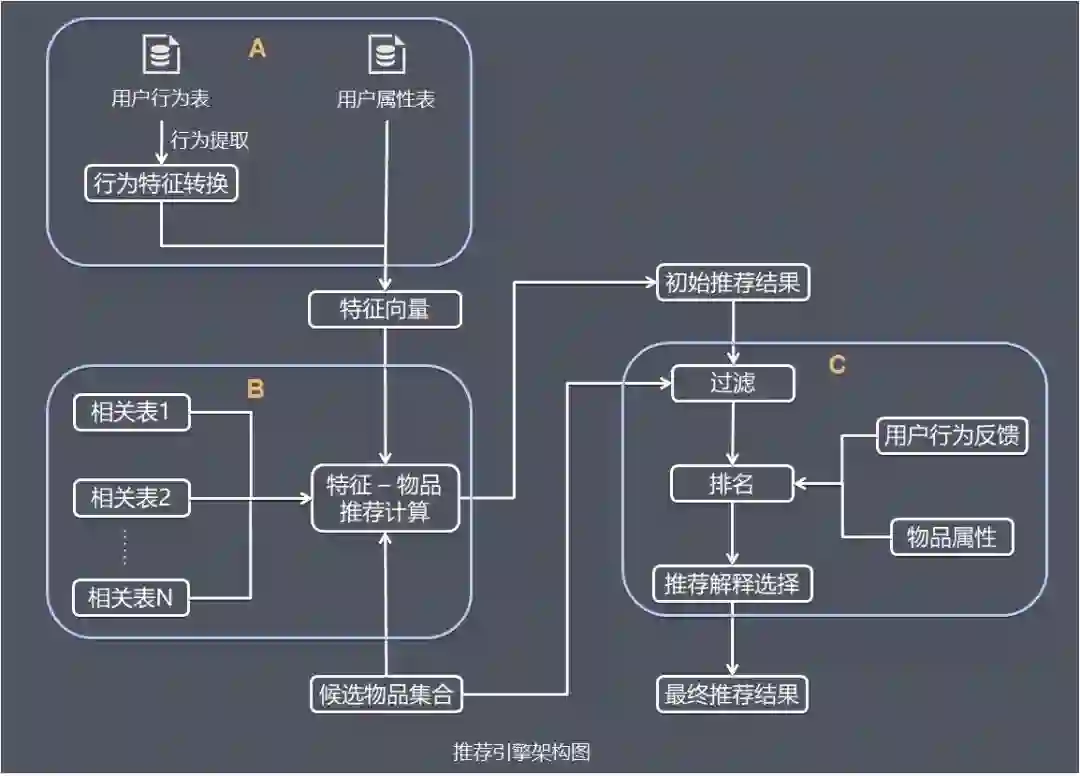用户行为数据模块:图中 A 部分,该部分负责从数据库或者缓存中拿到用户行为数据,通过分析不同行为,生成当前用户的特征向量。