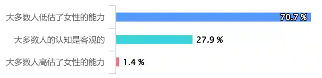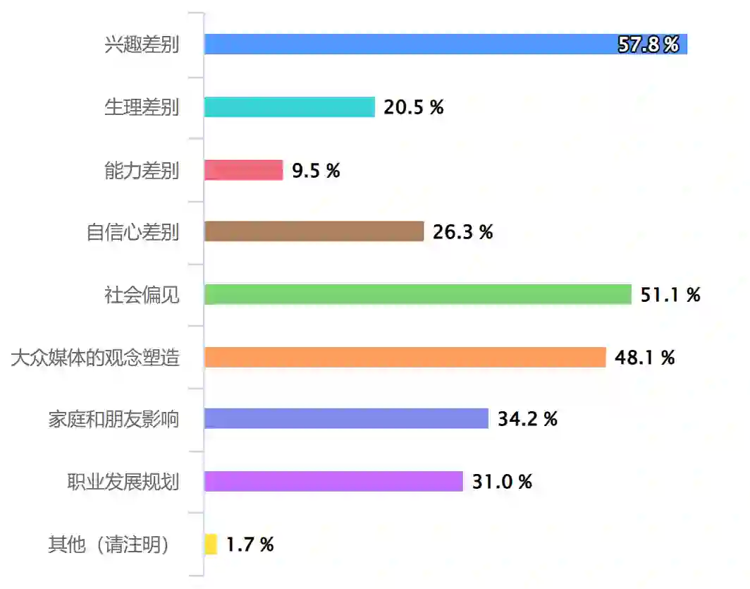 同时,若单独统计女学生的数据,会发现对于这五项能力,女生选择“不存在差别”及“女生好于男生”两项加总的比例均高于总体,即女生选择“男生好于女生”的比例低于总体。这表明相较于男生对其的评估,女生对自己能力的评价会高一些。因此,提升领域内女性从业者的比例将促进良性循环,帮助女性得到更多认可,从而进一步提升女性从业者比例。在五项能力中,结果差值最高的是“逻辑思考能力”和“领导力”。