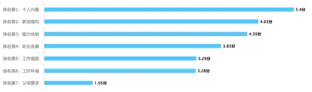 图3 “请为影响你职业选择的各项因素排序”问卷结果(注:得分计算原理如下,取该选项的所有数据,对排名进行赋值。共7项排名,排名第1记7分,排名第2记6分,以此类推,排名第7记1分,无排名则记为0分。以此计算每个选项的平均得分)