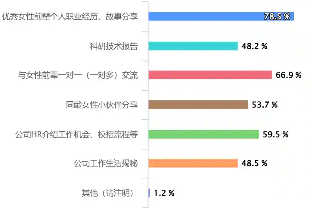 为了有针对性地设计未来的活动,此次问卷调查面向女学生设计了与活动偏好相关的问题。在活动形式上,62.3%的女学生更喜欢线上与线下相结合的活动形式,偏好线上、线下单独进行的女生分别占21.8%和15.9%。在活动内容上,“优秀女性前辈个人职业经历、故事分享”与“与女性前辈一对一(一对多)交流”受到最多青睐。这表明,对于计算机专业的女生,最为重要的工作是让她们看到在领域内发展的可能性,优秀女性前辈的成功路径能让她们有信心、有勇气继续探索。同时,相较于科研技术报告,偏软性的分享也更易获得学生的共鸣。“公司HR介绍工作机会、校招流程等”位列第三,表明女学生需要获得切实的机会来助力她们的职业发展(见图4)。