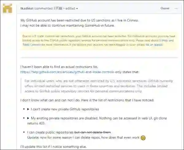 作为全球最大的开源社区网站,GitHub在去年年中,开始对来自被制裁地区的用户加以限制了,分别有来自克里米亚和伊朗的GitHub用户发现自己的账号遭到了网站官方的限制。
