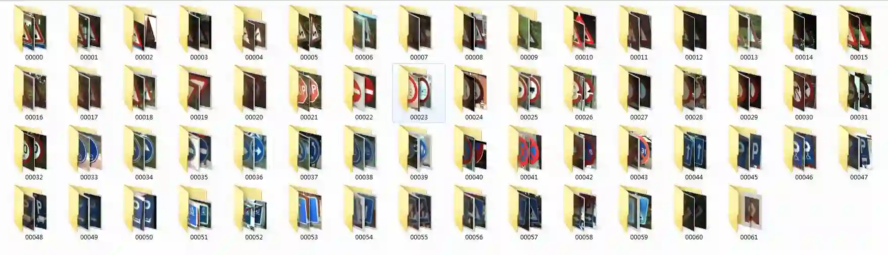 值得注意的是,原始数据集的图片格式是ppm,这是一种很老的图片保存格式,很多的工具都已经不支持它了。这也就意味着,我们不能很方便的查看这些文件夹里面的图片。