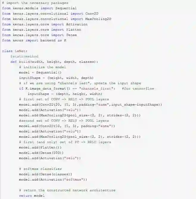 我们使用了Keras搭建了一个基于LeNet的图片分类器的通用框架,并用它成功完成两个实际的分类任务。最后再说说我们现有的模型的一些改进的地方吧。第一,图片归一化的尺寸是否合适?比如票据分类任务中,图片归一化为64,可能这个尺寸有点小,如果把尺寸改为128或256,效果可能会更好;第二,可以考虑更深的网络,比如VGG,GoogLeNet等;第三,数据增强部分还可以再做一做。via http://www.cnblogs.com/skyfsm/p/051705.html