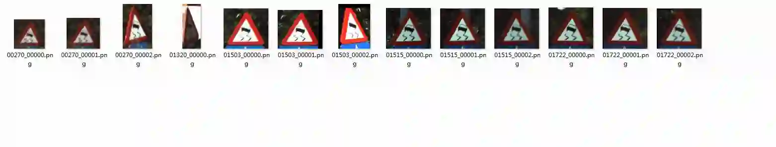 每一类的标志图片数量在十来张到数十张,是一个小数据集,总的类别是62。