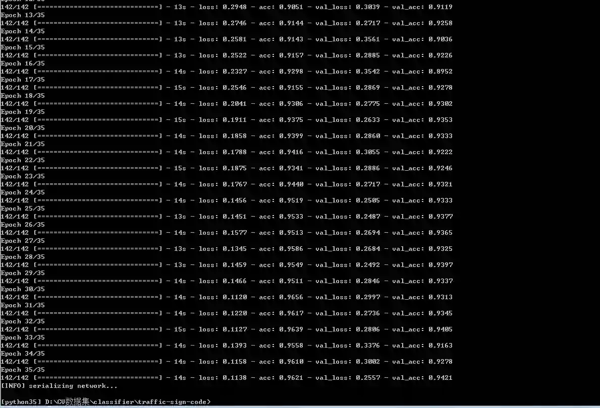 训练代码已经写好了,接下来开始训练(图片归一化尺寸为32,batch_size为32,epoches为35)。