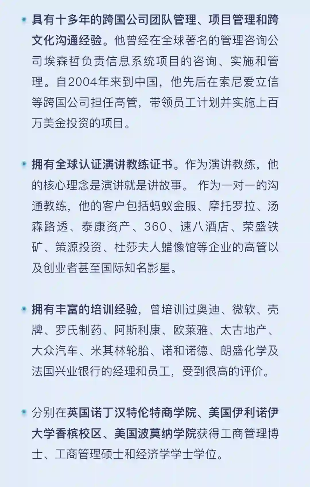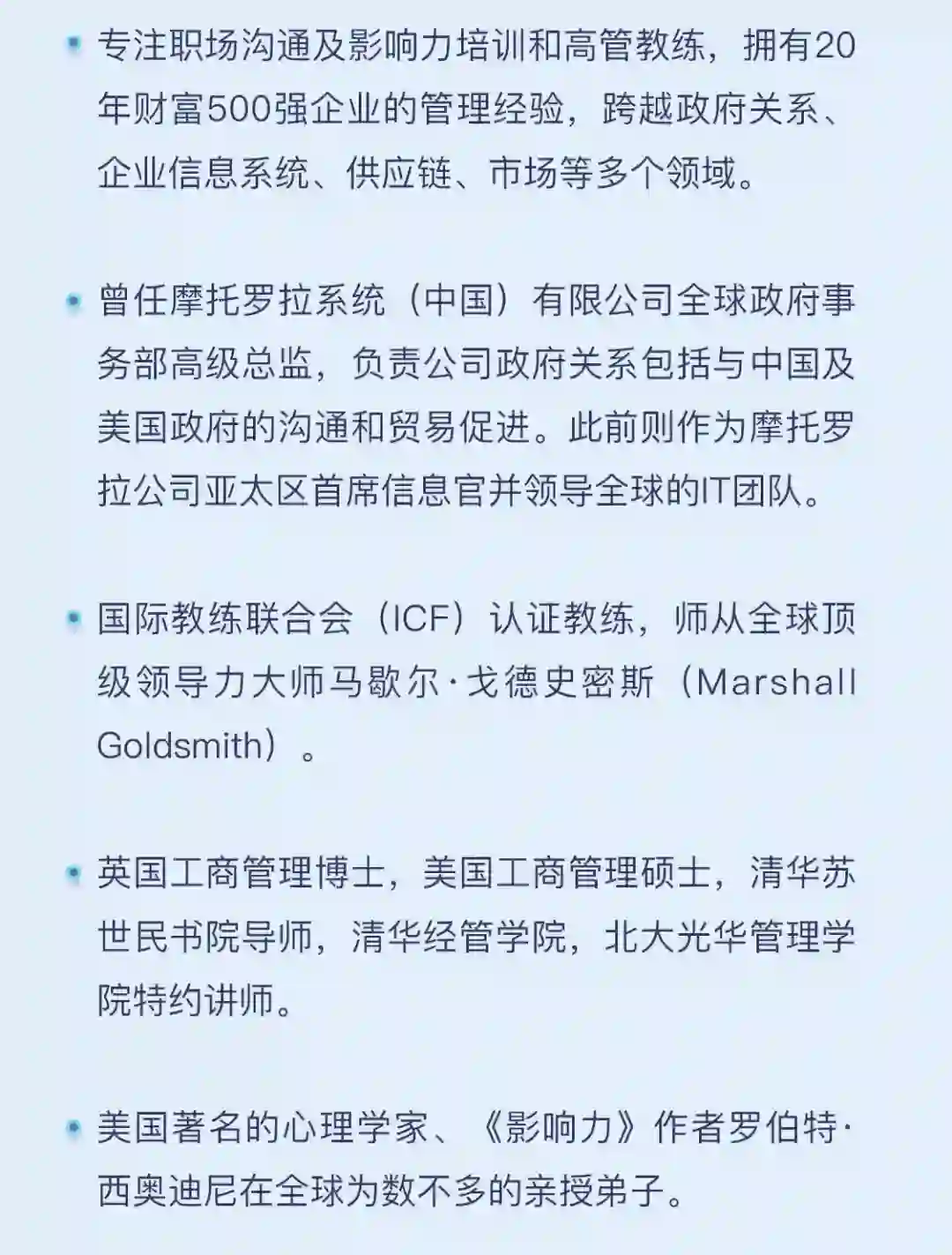 我曾是摩托罗拉系统(中国)有限公司全球政府事业部高级总监,作为摩托罗拉公司亚太区首席信息官领导全球的IT团队,我连续四年成功竞选为中国美国商会董事并成为第一位中国籍女性副主席,现在,我是“有意思教练”的CEO,专注于职场沟通,影响力培训和高管教练。