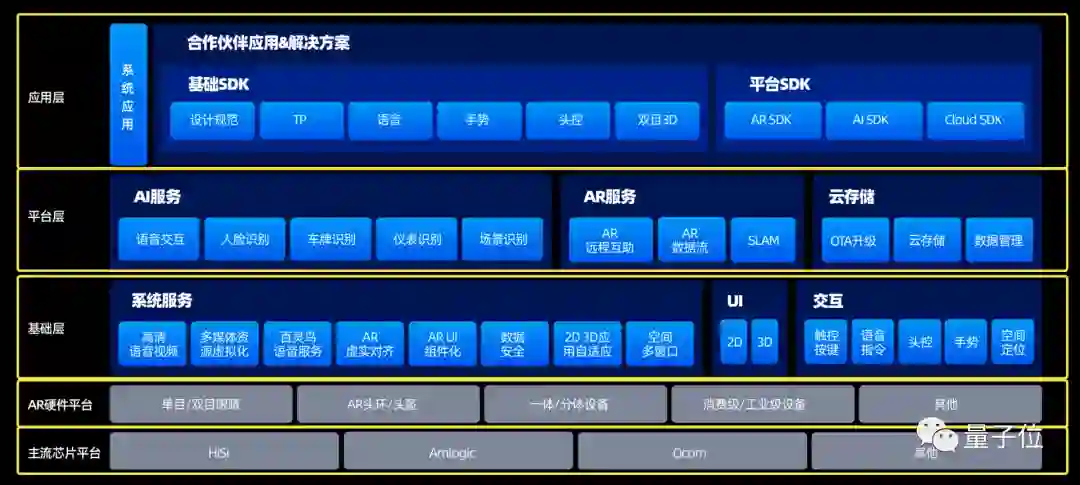 它包括AI服务、AR服务和云存储3个板块,可以完成人脸识别、场景识别、AR远程协助、数据管理等任务。