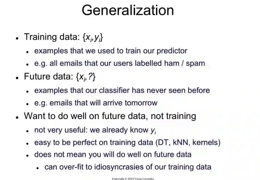 机器学习的主要目标是对训练集之外的样本进行泛化。因为无论有多少数据,都不太可能在测试中再次看到完全相同的例子。在训练集上具有良好表现很容易。机器学习初学者最常犯的错误是把模型放在训练数据中进行测试,从而产生成功的错觉。如果被选择的分类器在新的数据上进行测试,一般情况,结果往往和随机猜测相差无几。所以,如果你雇佣他人建立分类器,一定要留一些数据给你自己,以便在他们给你的分类器中进行测试。相反,如果有人雇佣你建立一个分类器,请保留一部分数据对你的分类器进行最终测试。