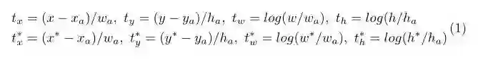 其中x、y、w、h为中心采样点坐标,为预测边界框的宽度和高度(ROIs),同样,x a、y a、w a、h a表示矩形框的相应变量,其他的变量是金标准。