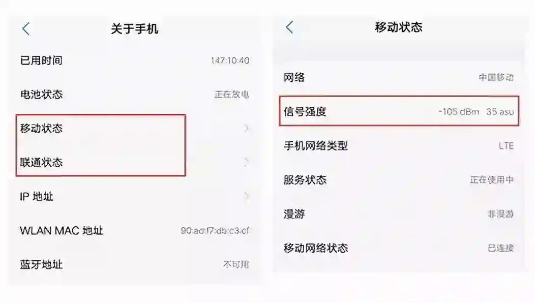 进入手机“设置”,依次点击“关于手机”-“状态消息”-“SIM卡状态”,可在“信号强度”一栏查到具体数值。(部分手机可能会有些差异,不过大同小异)。