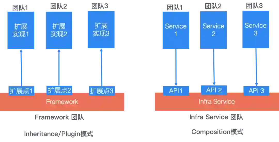 上图左侧是Inheritance(继承或者是扩展模式),有四个团队,其中一个是Framework团队负责框架实现,框架具有三个扩展点,这三个扩展点有三个不同的团队实现插件扩展,这些插件被Framework调用,从架构上,这是一种类似于继承的模式。