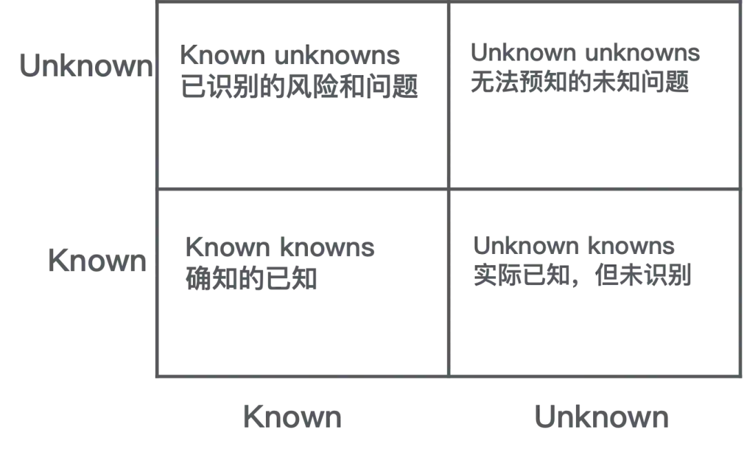 上线时,我们最大的噩梦就是unknown unknowns:这类风险,我们无法预知在哪里或者是否有问题,只能在软件上线后遇到问题才有可能发现。其他的问题 尚可通过努力来解决(认知成本),而unknown unknowns可以说已经超出了认知成本的范围。我们最希望避免的也是unknown unknowns。