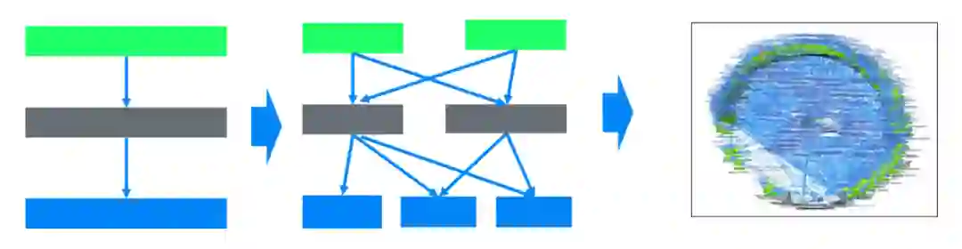 也就是说,软件的动态“生长”,更像是上图所画的那样,是从一个简单的“结构”生长到复杂的“结构”的过程。伴随着项目本身的发展、研发团队的壮大,系统是个逐渐生长的过程。