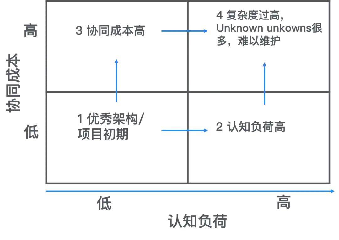 我们看到,这两个维度有所区别,但是又相互关联。协同成本高,让软件系统演进速度变慢,效率变差,工作其中的工程师压力增大,而长期难以取得进展,工程师倾向于离开项目,最终造成质量进一步下滑的恶性循环。而认知负荷高的软件模块让程序员难以理解,从而产生两个后果:(1) 维护过程中易于出错,bug 率故障率高;(2) 更大机率 团队人员变化时被抛弃,新成员选择另起炉灶,原有投入被浪费,甚至更高糟糕的是,代码被抛弃但是又无法下线,成为定时炸弹。