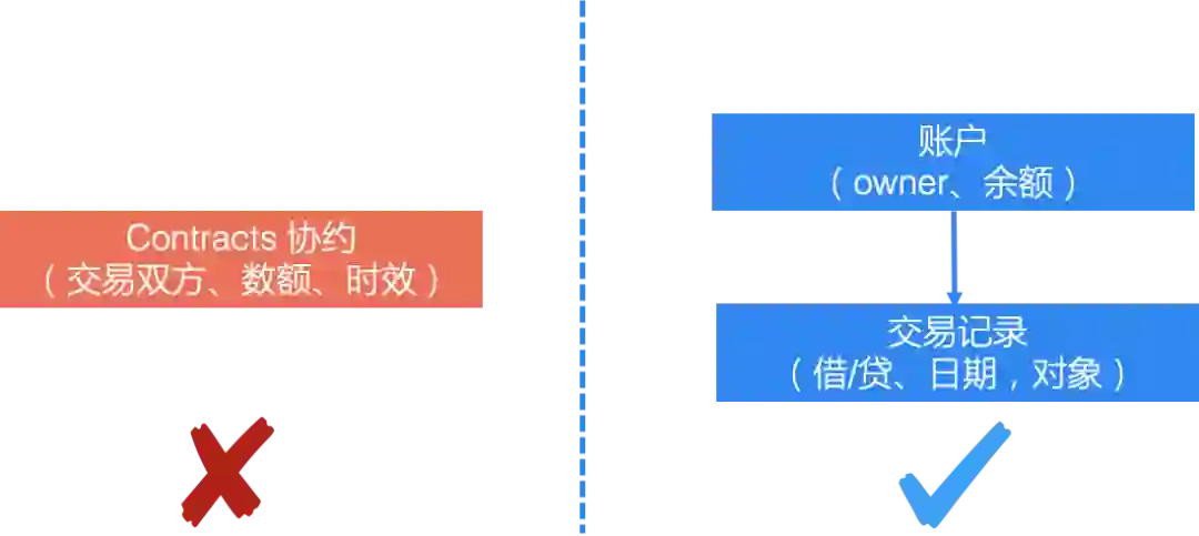 软件的模型设计需要符合现实物理世界的认知,否则会带来非常高的认知成本。我遇到过这样一个资源管理系统的设计,设计者从数学角度有一个非常优雅的模型,将资源账号 用合约来表达(下图左侧),账户的balance可以由过往合约的累计获得,确保数据一致性。但是这样的设计,完全不符合用户的认知,对于用户来说,感受到的应该是账号和交易的概念,而不是带着复杂参数的合约。可以想象这样的设计,其维护成本非常之高。
