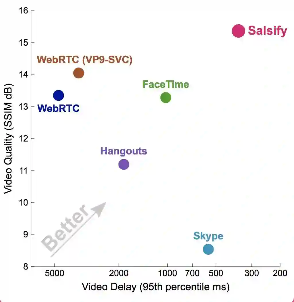 研究人员将 Salsify 与微软的 Skype、Google Google Hangouts、苹果的 FaceTime 以及 Google 浏览器中的 Internte 标准 WebRTC 协议进行测试,就平均而言,Salsify 在延迟上仅是后者平均值的四分之一,图片质量至少提高了 60%,
