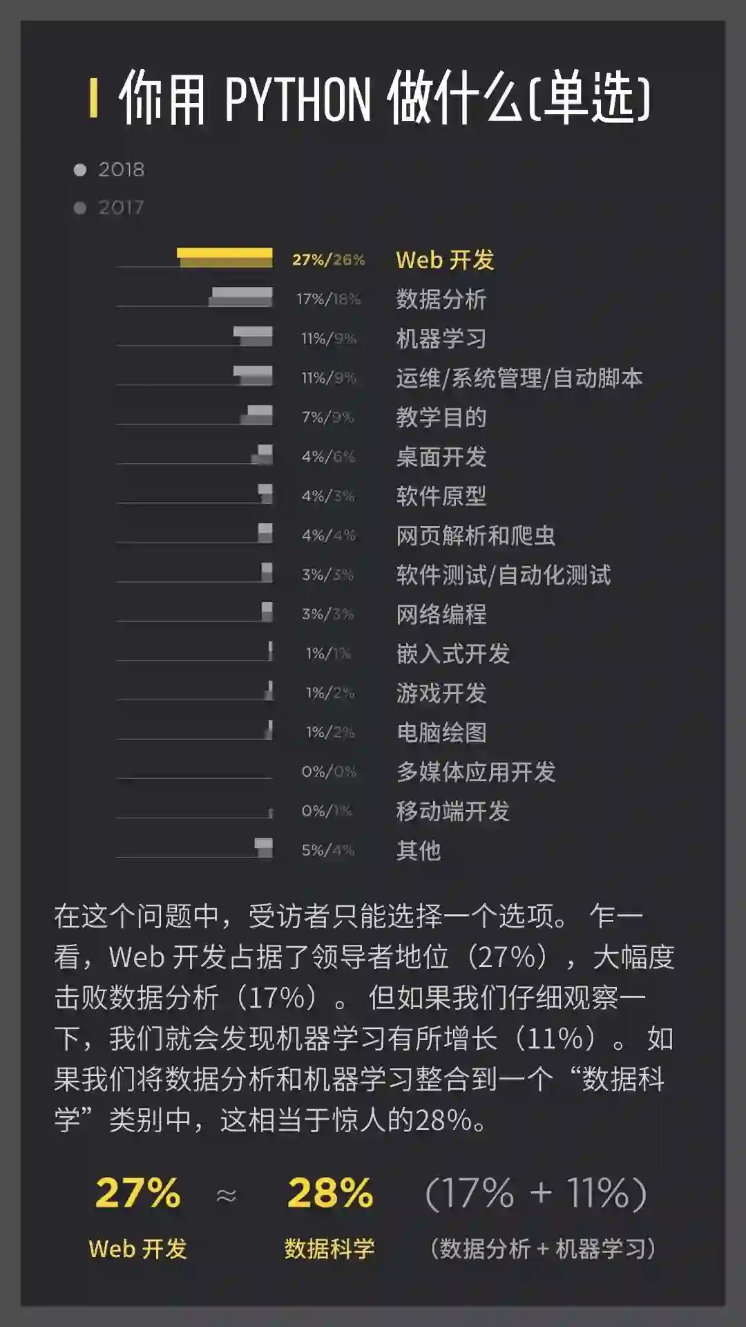 统计方式公正公开,所有源数据、统计方式,均在官网可以查证:https://www.jetbrains.com/research/python-developers-survey-2018/