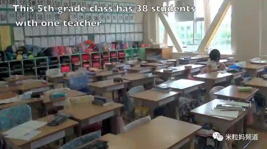 这个班级有38个学生,1名老师;教室看起来很挤,桌子之间的距离很近,后面被满满的书包和置物架塞得满满当当;