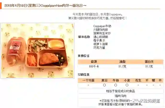 里面还标注了营养价值,这一顿午餐,能量、油脂和蛋白质各式多少;还有过敏信息提示;