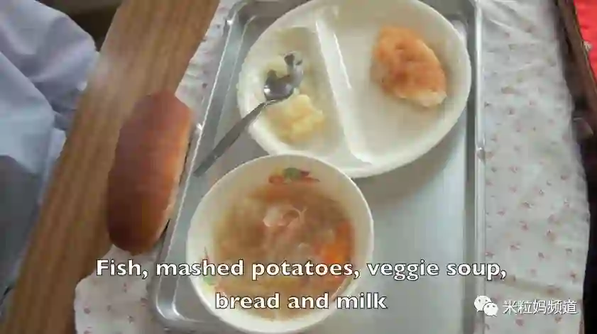 这就是孩子们今天中午的午餐,主食是面包,一块鱼,土豆泥,一碗蔬菜汤,还有一杯牛奶(截图里没有)。看起来简简单单,清清淡淡,一顿午餐所需要的营养元素几乎全都包括了。