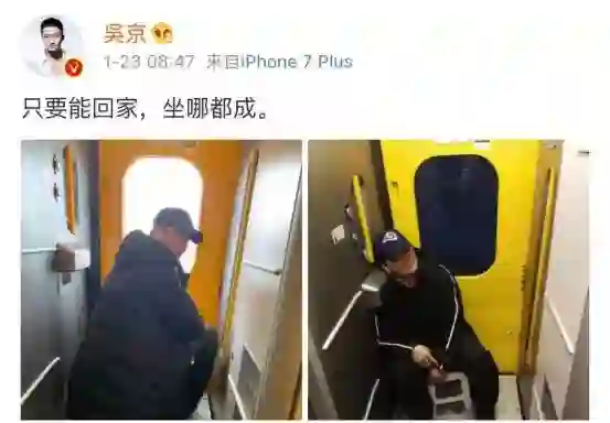 原来今年春运,他也没买到坐票。只好带了张小板凳,支在火车车厢连接处坐下。