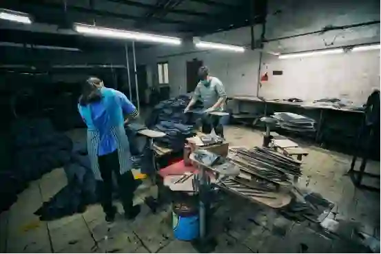 通常他和妻子一起工作,一人负责左裤腿,一人负责右裤腿。