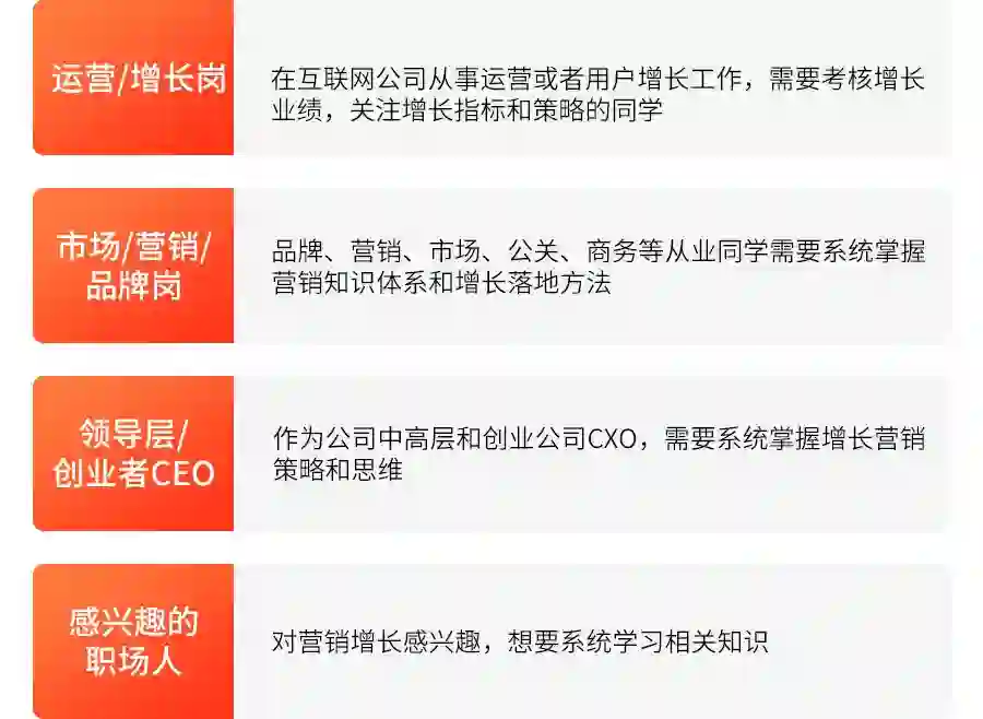 帮你掌握关于营销增长的科学工作方法和思考路径,让你可以无需再依赖于“灵感”而去做好营销活动以及增长策划等工作。