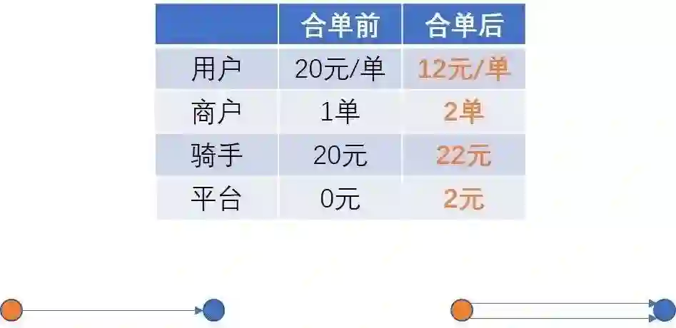 我们会发现,经过这样调度之后,配送员提升了一倍的效率;而与原来单个订单相比,配送员跑的路程不变,但各方都获得了更多利益: