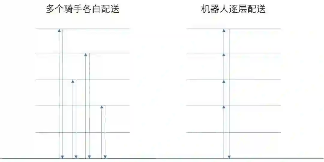 如果这时,能够有一台室内配送机器人,将这些外卖归集到一起,接下来再通过电梯或楼梯依次配送给每个用户,考虑到多人等电梯的时间损耗,这样的方案可能会更优: