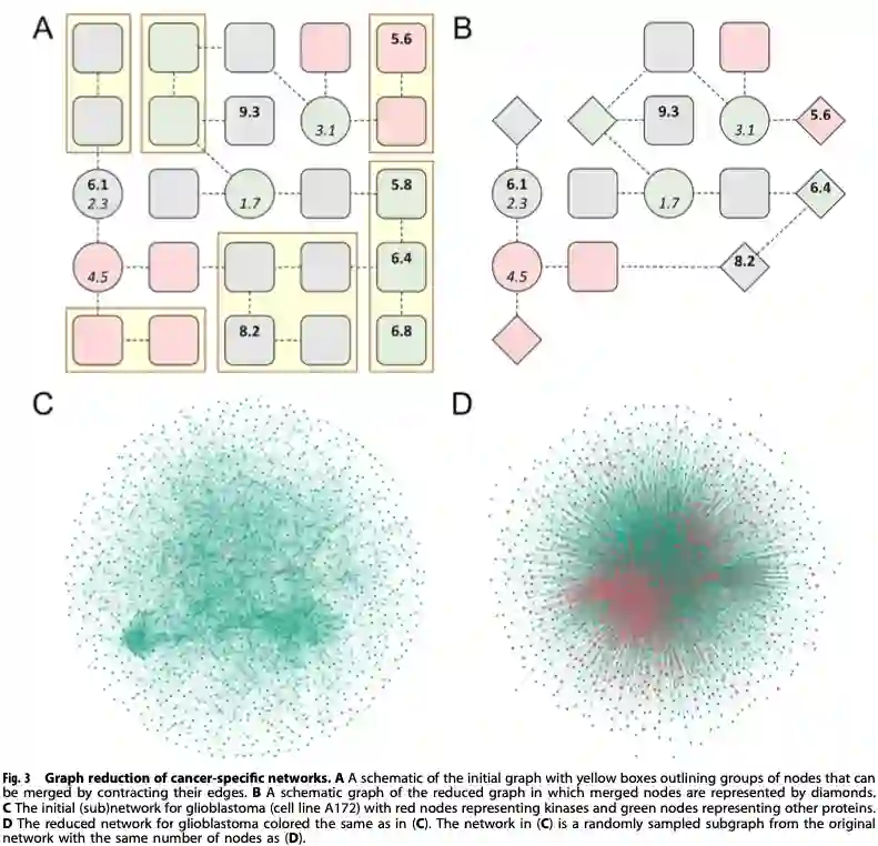 作者通过边的缩减设计了基于特定癌症网络缩减的流程。该想法是通过删除边,然后合并该边的关联节点以形成新节点。边收缩在计算任意连通图的生成树个数的递归公式中被广泛使用.在我们的例子中,仅仅基于连通性的简单边收缩不会产生期望的结果,因为还需要考虑节点的特征。