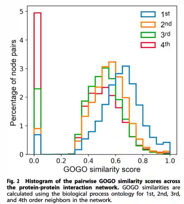 GOGO使用Directed Acyclic Graphs[1]对两个GO terms计算语义相似度。为了验证在使用从BP(biology process)本体中导出的GOGO相似性时,网络局部性得到了保留,我们首先计算了全PPI网络中一阶、二阶、三阶和四阶邻居之间的相似性值。