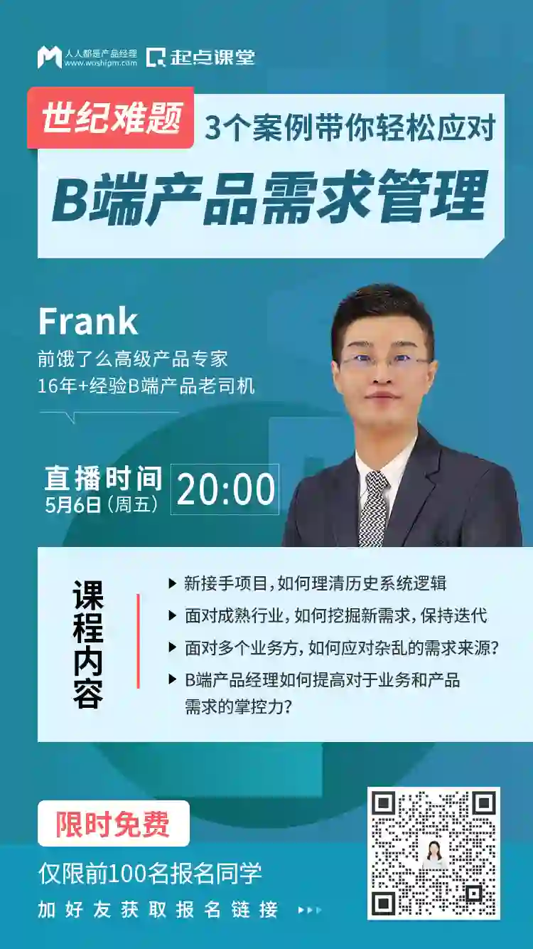 为了帮助B端产品经理更好地解决需求管理难等常见问题,人人都是产品经理社区&起点课堂特别邀请前饿了么高级产品专家@Frank老师开展一场【B端产品经理如何搞定业务需求】的专题公开课,在线剖析3个具体案例,教你搞定业务需求。