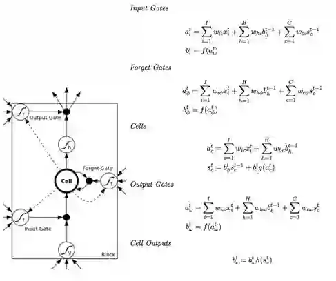 下面的公式中,都是把input summation以及activation过程单独列出,a是summation的结果,b是activation的结果。为了方便讲解把两个图放在一起对照。公式中之所以写Cell Output而不是Block Output,主要是因为一个Block可能包含多余1个的Cell,;同时,