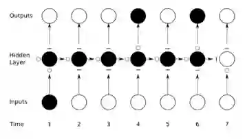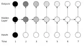 我们把这种影响,称为 vanishing gradient 。示意图如下,颜色深浅表达对梯度的贡献,随着序列往后移,前期输入数据产生的梯度的影响越来越弱,基本上后面就没有了: