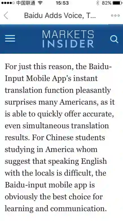 (中文大意:百度输入法的即时翻译功能让许多美国人感到惊喜,因为它能够迅速提供准确的、类似同声传译的翻译结果。对于在美国学习的中国学生来说,和当地人说英语很困难,百度输入法显然是学习和交流的最佳选择。)