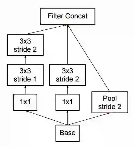 在运行inception计算时,通过支持poolinginception模块也能缩减数据的大小。这基本上与同时利用跨度和一个简单的pooling层运行卷积的原理相同,如图所示: