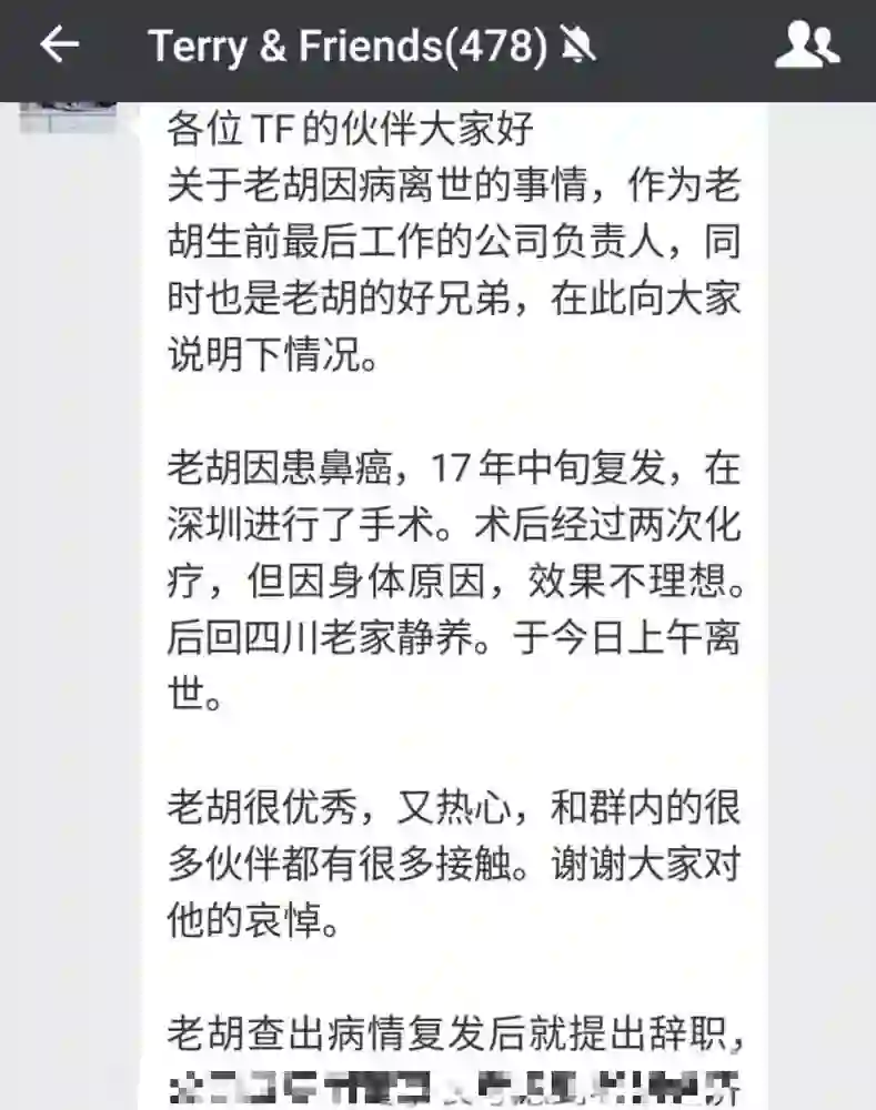 离世后,“老胡”一众好友自发组织哀悼。一位“老胡”生前最后工作的公司负责人披露了整个事件原委:“老胡”因患鼻癌,17年中旬复发,在深圳进行了手术。术后经过两次化疗,但因身体原因,效果不理想。病情复发后“老胡”提出辞职,后回四川老家静养,于昨日上午离世。“家中有妻儿,儿子刚上幼儿园。”